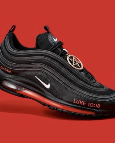 The shoes feature a Satanic symbol, the number of the beast, and Luke 10:18.